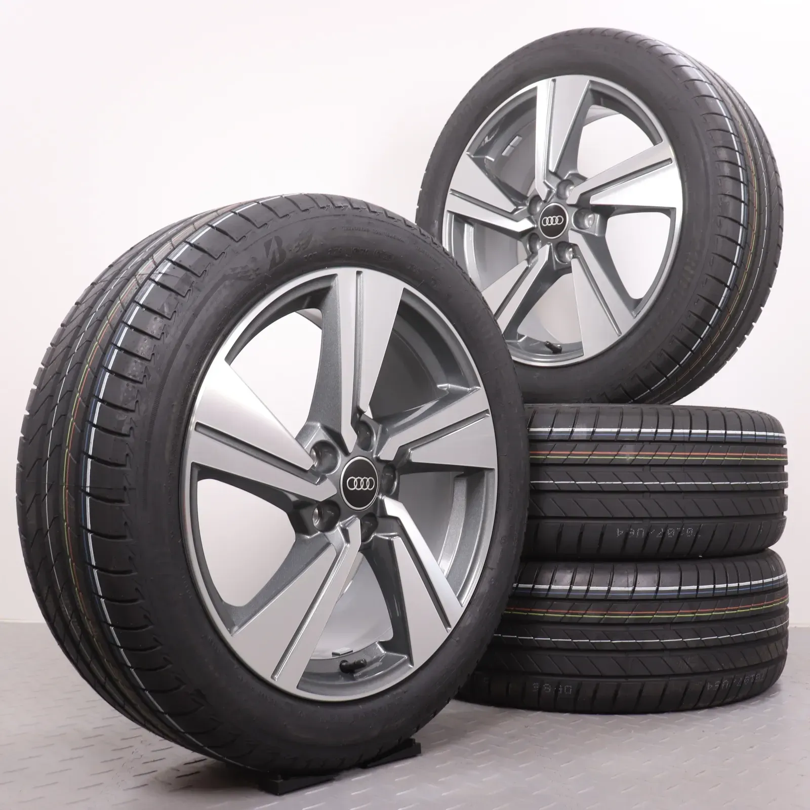 Sommerräder 18 Zoll Audi Q2 & SQ2 GA Original Felgen 81A601025G Sommerreifen 215/50R18 92W AO Bridgestone Turanza T005 5-Arm-Dynamik-Design grau glanzgedreht 7x18ET45 NEU