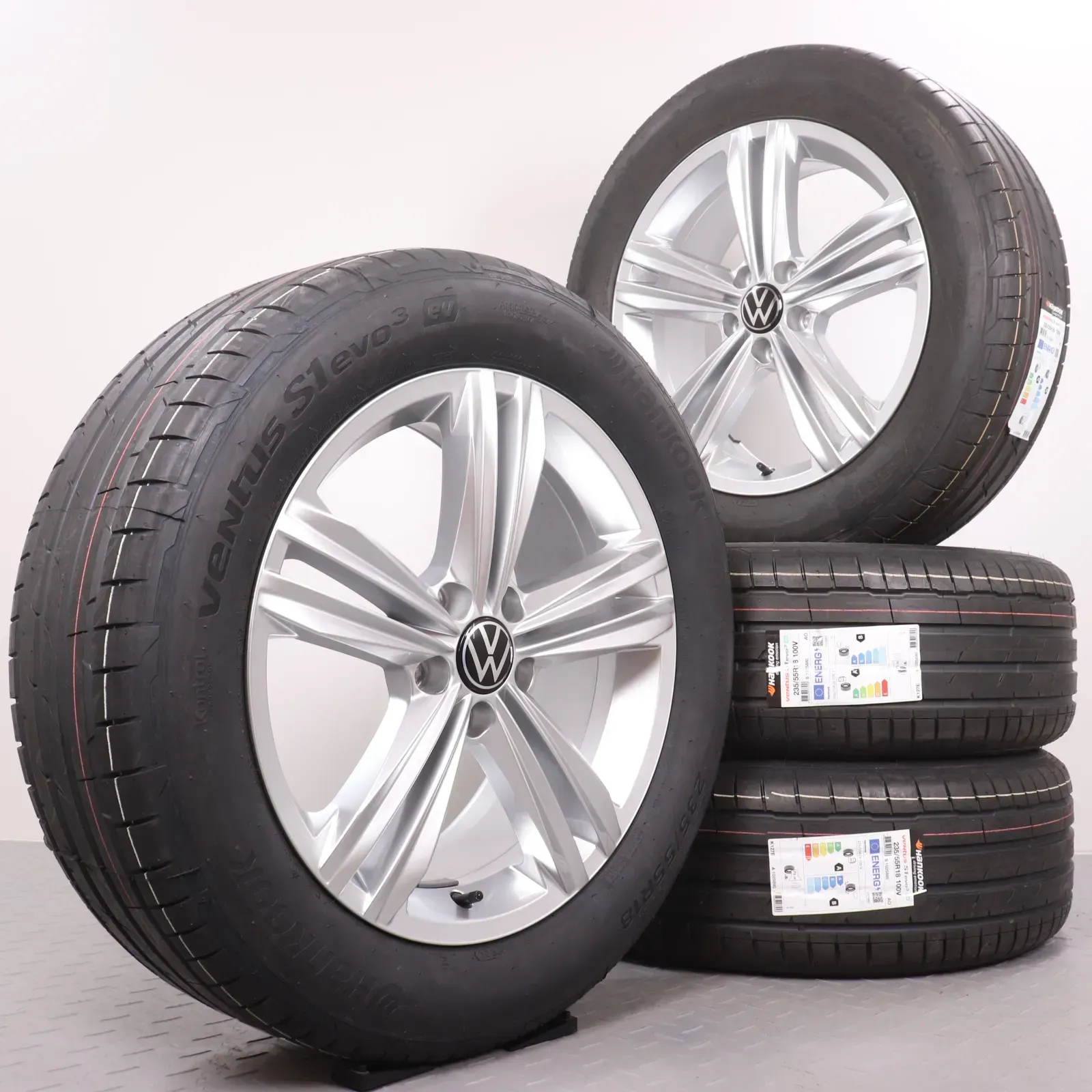 Sommerräder 18 Zoll VW Tiguan II & Allspace Original Felgen 5NA601025M Sommerreifen 235/55R18 100V XL (Extra Load), AO (VAG-Original) Hankook Ventus S1 EVO3 Sebring silber 7x18ET43