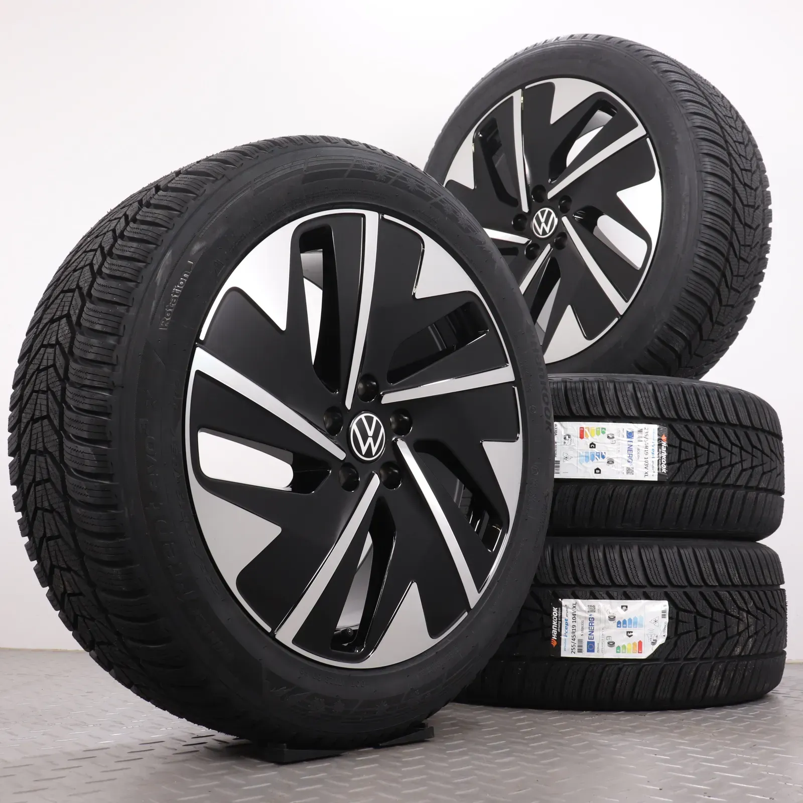 Winterräder 19 Zoll VW ID.7 ED Felgen 14B601025A & B Winterreifen 235/50R19 & 255/45R19 Hankook Winter i*cept EVO3 Hudson schwarz glanzgedreht 8x19ET45 & 8,5x19ET42 5x112 Alufelgen